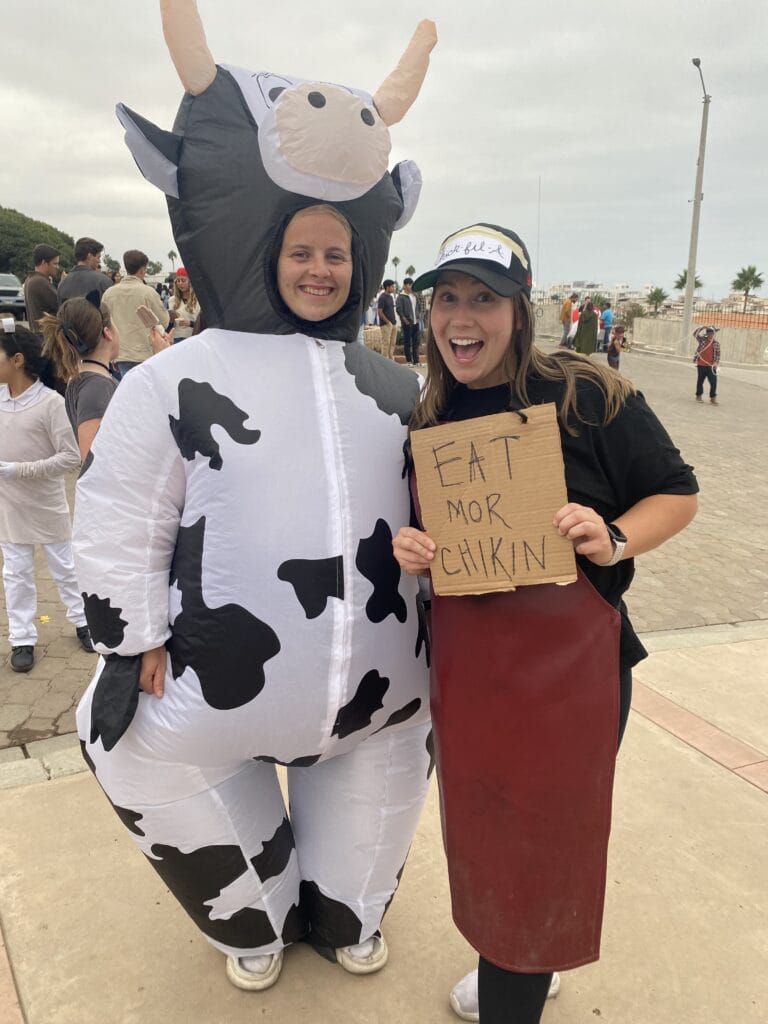 We were joined by the DTS from Ensenada this week for class. We will be going to their campus in a month for a week as well. On Wednesday, we had a harvest festival full of food, blow up houses/activities, horses/camels and a dress up competition. Did I join the competition, yes. Did I perform and shout about cows in front of a large crowd? Yes. “No mates las vacas.” “Don’t kill the cows.” My friend in the cow is Christina (from Norway). She makes me laugh until my stomach muscles hurt or until I nearly pee my pants (very nervous for the day this happens). P.s I am a Chick-Fil-A worker – apron from the kitchen, hat from a friend, cardboard from Amazon box.